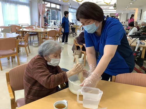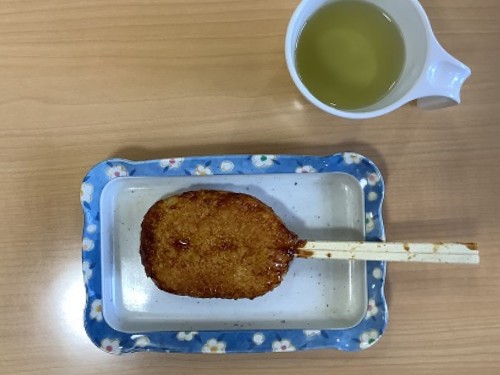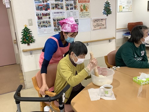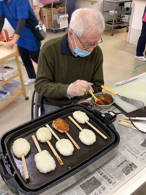 デイではおやつレクリエーションで五平餅作りに挑戦!お米を潰す係とお味噌を塗り焼く係と協力し お店に出してもおかしくないほど上手にできました!